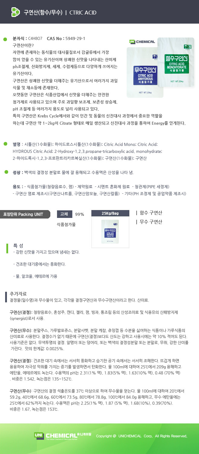 ±¸¿¬»ê(ÇÔ¼ö/¹«¼ö) | CTRIC ACID ºÐÀÚ½Ä : C4H8O7 CAS No : 5949-29-1±¸¿¬»êÀ̶õ?ÀÚ¿¬¿¡ Á¸ÀçÇÏ´Â µ¿½Ä¹°ÀÇ ´ë»ç¹°Áú·Î¼ °¨±Ö·ù¿¡¼ °¡À帹ÀÌ ¾òÀ» ¼ö ÀÖ´Â À¯±â»êÀÌ¸ç »óÄèÇÑ ½Å¸ÀÀ» ³ªÅ¸³»´Â »ê¹ÌÁ¦phÁ¶ÀýÁ¦, »êȹæÁöÁ¦, ¼¼Á¦, ¼ö·ÅÁ¦µîÀ¸·Î ´Ù¾çÇÏ°Ô ¾²¿©Áö´ÂÀ¯±â»êÀÌ´Ù.±¸¿¬»êÀº »óÄèÇÑ ½Å¸ÀÀ» ´õÇØÁÖ´Â À¯±â»êÀ¸·Î¼ ¿©·¯°¡Áö °úÀϽŰ ¹× ä¼Òµî¿¡ Á¸ÀçÇÑ´Ù.¿À·§µ¿¾È ±¸¿¬»êÀº ½Äǰ»ê¾÷¿¡¼ ½Å¸ÀÀ» ´õÇØÁÖ´Â ¾ÈÀüÇÑ÷°¡Á¦·Î »ç¿ëµÇ°í ÀÖÀ¸¸ç ÁÖ·Î °úÀÏÇâ º¸Á¶Á¦, º¸Á¸¼º »ó½ÂÁ¦, pH Á¶ÀýÁ¦ µî ¿©·¯°¡Áö ¿ëµµ·Î ³Î¸® »ç¿ëµÇ°í ÀÖ´Ù.ƯÈ÷ ±¸¿¬»êÀº Krebs Cycle¿¡¼¿Í °°ÀÌ Àΰ£ ¹× µ¿¹°ÀÇ ½ÅÁø´ë»ç °úÁ¤¿¡¼ Áß¿äÇÑ ¿ªÇÒÀ»Çϴµ¥ ±¸¿¬»ê ¾à 1~2kgÀÌ Citrate ÇüÅ·Π¸ÅÀÏ »ý»êµÇ°í ½ÅÁø´ë»ç °úÁ¤À» ÅëÇÏ¿© Energy¸¦ ¾ò°ÔµÈ´Ù.º°¸í : ½ÃƲ»ê(1¼öȹ°); ÇÏÀ̵å·Î½º½ÃƲ»ê(1¼öȹ°); Citric Acid Mono; Citric Acid; HYDROUS Citric Acid; 2-Hydroxy-1,2,3,propane-tricarboxylic acid, monohydrate; 2-ÇÏÀ̵å·Ï½Ã-1,2,3-ÇÁ·ÎÆÇÆ®¸®Ä«¸£º¹½Ç»ê(1¼öȹ°); ±¸¿¬»ê(1¼öȹ°); ±¸¿¬»ê¼º»ó : ¹é»öÀÇ °áÁ¤¼º ºÐ¸»·Î ¹°¿¡ Àß ¿ëÇØµÇ°í ¼ö¿ë¾×Àº »ê¼ºÀ» ³ªÅ¸ ³¿.¿ëµµ : - ½Äǰ÷°¡¹°(û·®À½·á¼ö, Àë) - Á¦¾à¿ø·á - ½Ã¸àÆ® È¥ÈÁ¦ ¿ø·á - û°üÁ¦(PIPE ¼¼Á¤Á¦)- ±¸¿¬»ê ¿°·á Á¦Á¶½Ã(±¸¿¬»ê³ªÆ®·ý, ±¸¿¬»ê¾Ï¸ð´½, ±¸¿¬»êÄ®·ý) - ±âŸ(PH Á¶Á¤Á¦ ¹× °ø¾÷¾àǰ Á¦Á¶½Ã) Ư ¼º- °ÇÑ ½Å¸ÀÀ» °¡Áö°í ÀÖÀ¸¸ç ³¿»õ´Â ¾ø´Ù.- °ÇÁ¶ÇÑ ´ë±âÁß¿¡¼´Â dzÈÇÑ´Ù.- ¹°, ¾ËÄÚ¿Ã, ¿¡Å׸£¿¡ °¡¿ë Ãß°¡ÀÚ·á°áÁ¤¹°(Àϼö¿°)°ú ¹«¼ö¹°ÀÌ ÀÖ°í, °¢°¢À» °áÁ¤±¸¿¬»ê°ú ¹«¼ö±¸¿¬»êÀ̶ó°í ÇÑ´Ù. »ê¹Ì·á. ±¸¿¬»ê(°áÁ¤): û·®À½·á¼ö, È¥¼ºÁÖ, ĵµð, Á©¸®, Àë, ºù°ú, ÅëÁ¶¸² µîÀÇ »ê¼ºÁ¶¹Ì·á ¹× ½Ä¿ëÀ¯ÀÇ »êÆÐ¹æÁöÁ¦(synergist)·Î¼ »ç¿ë. ±¸¿¬»ê(¹«¼ö): ºÐ¸»ÁÖ½º, °¡·ç¹ßÆ÷Á꽺, ºÐ¸»»þºª, ºÐ¸» ÄÉÂý, ÃòÀײ µî ¼öºÐÀ» ½È¾îÇÏ´Â ½ÄǰÀ̳ª °¡·ç½ÄǰÀÇ»ê¹Ì·á·Î »ç¿ëÇÑ´Ù. °áÁ¤¼ö°¡ ¾ø±â ¶§¹®¿¡ ±¸¿¬»ê(°áÁ¤)º¸´Ùµµ »êµµ´Â °ÇÏ°í »ç¿ë½Ã¿¡´Â ¾à 10% Àû¾îµµ µÈ´Ù. »ç¿ë±âÁØÀº ¾ø´Ù. ¹«»öÅõ¸íÀÇ °áÁ¤. ¾Ë¸ÍÀÌ ¶Ç´Â µ¢¾î¸®, ¶Ç´Â ¹é»öÀÇ °áÁ¤¼ººÐ¸» ¶Ç´Â ºÐ¸»·Î, ¹«Ãë, °ÇÑ »ê¹Ì¸¦ °¡Áø´Ù. ¸ÀÀÇ ÇѰ谪: 0.0025%. ±¸¿¬»ê(°áÁ¤): °ÇÁ¶ÇÑ ´ë±â ¼Ó¿¡¼´Â ¼¼È÷ dzÈÇÏ°í ½À±âÂù °ø±â ¼Ó¿¡¼´Â ¼¼È÷ Á¶ÇØÇÑ´Ù. ¶ß°Ì°Ô Çϸé¿ëÀ¶ÇÏ¿© Àڱؼº ¾ÇÃ븦 °¡Áö´Â Áõ±â¸¦ ¹ß»ýÇÏ¸é¼ ÅºÈÇÑ´Ù. ¹° 100ml¿¡ ´ëÇÏ¿© 25¡É¿¡¼ 209g ¿ëÇØÇÏ°í¿¡Åº¿Ã, ¿¡Å׸£¿¡µµ ³ì´Â´Ù. ¼ö¿ë¾×ÀÇ pH´Â 2.31(1% ¾×), 1.83(5% ¾×), 1.63(10% ¾×), 0.48 (70% ¾×). ºñÁßÀº 1.542, ³ì´ÂÁ¡Àº 135~152¡É. ±¸¿¬»ê(¹«¼ö): ±¸¿¬»êÀÇ °áÁ¤ ¼®Ãâ¿Âµµ¸¦ 37¡É ÀÌ»óÀ¸·Î ÇÏ¿© ¹«¼ö¹°À» ¾ò´Â´Ù. ¹° 100ml¿¡ ´ëÇÏ¿© 20¡É¿¡¼59.2g, 40¡É¿¡¼ 68.6g, 60¡É¿¡¼ 73.5g, 80¡É¿¡¼ 78.8g, 100¡É¿¡¼ 84.0g ¿ëÇØÇϰí, ¹«¼ö ¿¡Åº¿Ã¿¡´Â25¡É¿¡¼ 62%±îÁö ³ì´Â´Ù. ¼ö¿ë¾×Àº pH´Â 2.25(1% ¾×), 1.87 (5% ¾×), 1.68(10%), 0.39(70%). ºñÁßÀº 1.67, ³ì´ÂÁ¡Àº 153¡É.